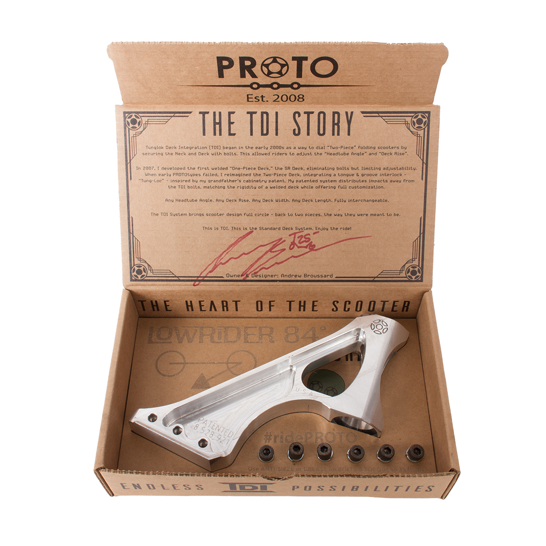 Tunglok Deck Integration (TDI) began in the early 2000s as a way to dial “Two-Piece” folding scooters by securing the Neck and Deck with bolts. This allowed riders to adjust the “Headtube Angle” and “Deck Rise”.